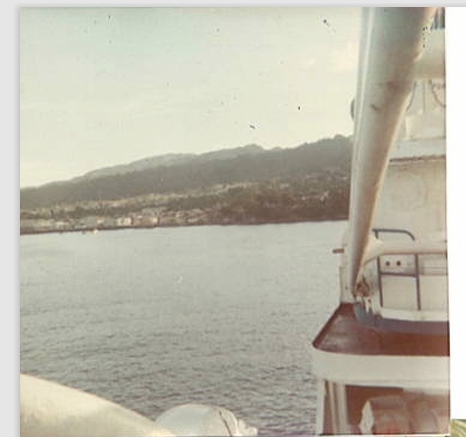 On the deck of the Federal Palm pulling into Rosseau harbor, Dominica, BWI, c.1971
