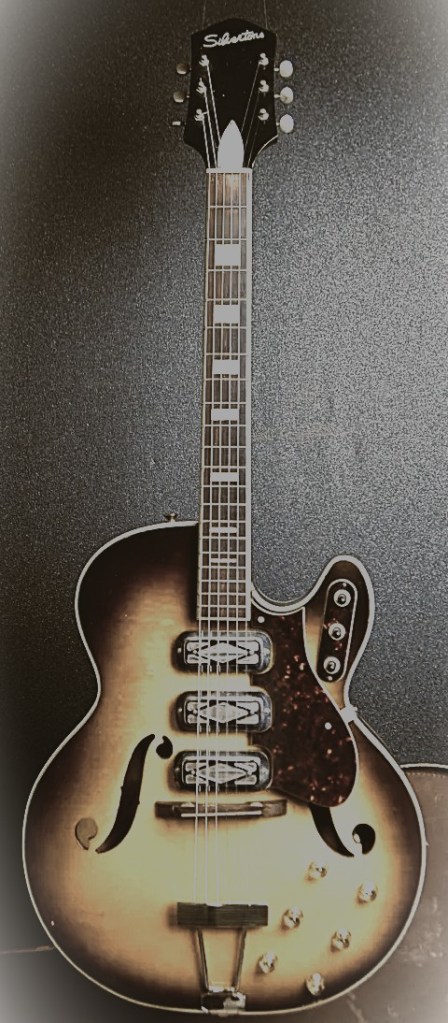 I was without a guitar for a rather long time in this period of aimlessness and I was too screwed up to be aware of it. One day I was playing pool with an acquaintance in the neighborhood, someone I knew, but not really well. As we played pool, I spied a guitar leaning in the corner of his basement. Asking about it, the acquaintance told me he did not play, it was his brother’s, who had passed away some while before. This fellow asked me if I wanted it, and I bought it for $25. It was an old Silvertone archtop electric guitar, very similar to the one I had as a teenage boy that was stolen in California. This was like being reunited with a long-lost old friend, getting a Silvertone guitar back in my possession.