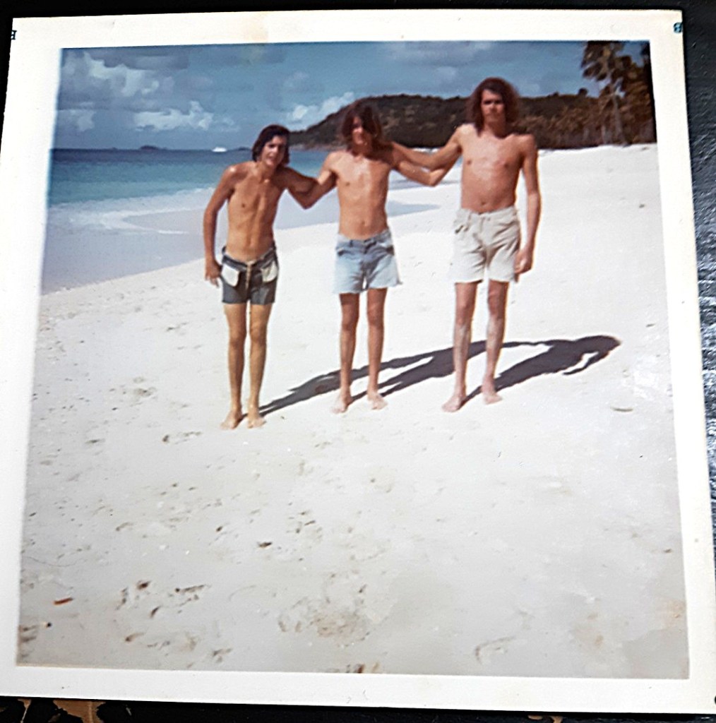 The Leavitt brothers on the beach, Antigua, British West Indies, Carribean islands, 1971. L-R: twin brothers Rob and Tom and Johnny Leavitt (1947-1973).
